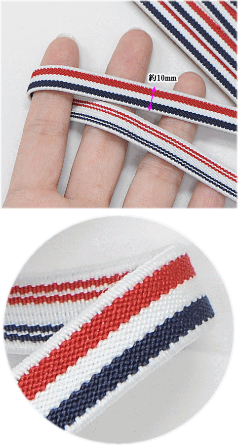 【商品詳細】■幅 10mm 厚み:約1.5mm ■長さ 約3m■素材 ゴム 糸:ポリエステル■カラー トリコロール(青・白・赤)■ゆうパケット 12点まで可能■ご注意・カット済みの商品の為、複数ご注文いただいても3mカットを長くすることは出来ません。