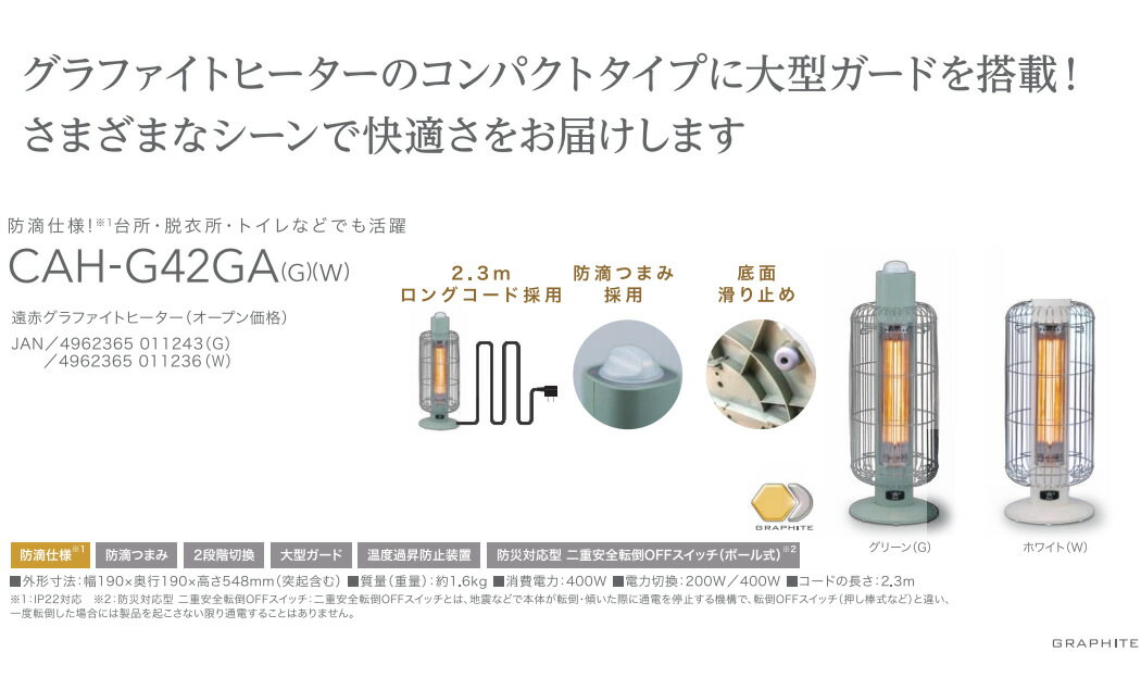 Aladdin CAH-G42GA(W) ホワイト アラジン 遠赤グラファイトヒーター[トリカゴ] 【製品仕様】 品番 CAH-G42GA-W [CAHG42GAW] サイズ 外形寸法W190×D190×H548 mm(突起含む) 質量 約 1.6 kg / コード長さ 2.3m 消費電力 400W 電力切替 200W / 400W 保証期間 メーカー保証1年間 特徴 大型ガード/防滴仕様/防滴つまみ/2段階切換/温度過昇防止装置/転倒OFFスイッチ(ボール式) ■遠赤グラファイトヒーター(トリカゴ) コンパクトタイプがリニューアル! 安全性とオシャレさを兼ね備えたデザインに! グラファイトヒーターのコンパクトタイプに大型ガードを搭載。